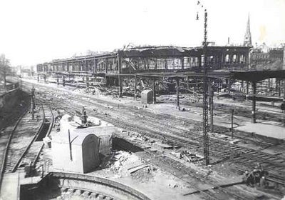 On the outskirts of the devastated city the two vehicle convoy came to the multiple tracks of the bombed out railroad yards (above). Here Sergeant Spruce sped ahead, while the Cadillac was required to stop for a short freight train. Woodring then crossed the tracks and resumed his speed of about 30 miles an hour.