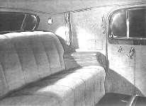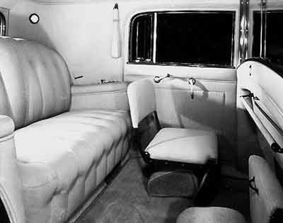 The front chrome grill of the Cadillac however was shattered like a boxer's front teeth, and the left front wheel hub was twisted and broken off, revealing the tire beneath (above). But the massive steel frame of the Cadillac then performed its unintended function and transferred most of the force of the accident directly to the passengers’ bodies. Sitting in the backseat, General Gay was thrown forward and then back against the seat. And Patton, who was already leaning forward and half turned to his left, was thrown off the bench seat and fell against the divider, his forehead striking the Fleetwood plaque, tearing a small section of skin and bending his neck sharply backward. In recoil he then fell across Gay on the seat.