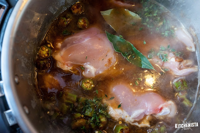 (Here's an additional tip - if you love okra like I do, double the amount in the recipe. Add half now, then add half after the chicken is cooked. Pressure cooking will soften the okra considerably, so I like the mix of the stewed okra and some pieces that have more of a bite left.)