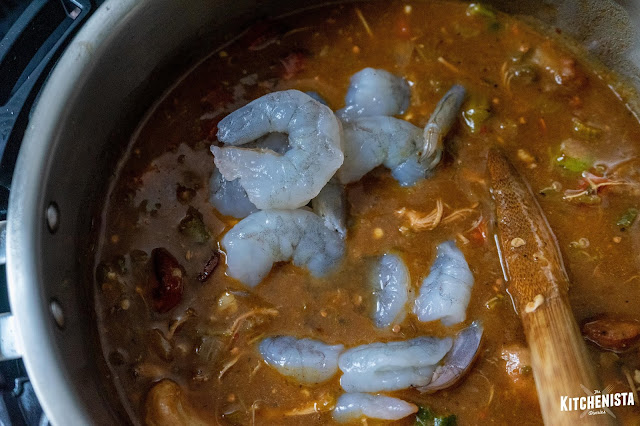 Stir in the Worcestershire sauce and vinegar, then give it a minute for flavors to meld. Taste test and make any adjustments to salt and spices. Fold in the peeled deveined shrimp. (It pains me not to add fresh oysters, but the ingredient list was long enough! Now would be the time if you are so inclined to include them, however.) The shrimp will only take a few minutes to poach in the hot gumbo broth.