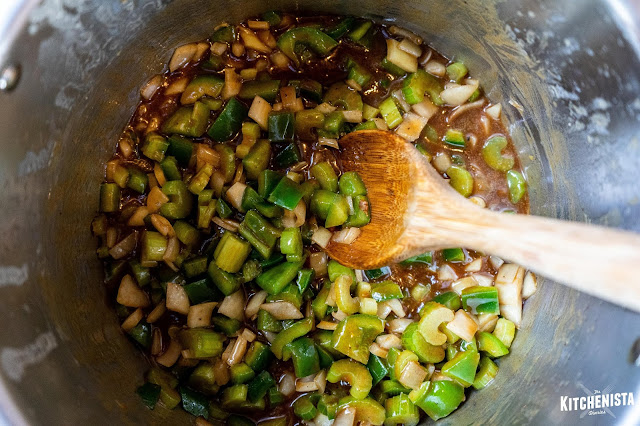 Add the diced onion, celery, bell pepper, and jalapeno to the roux. Stir to combine all the ingredients and then allow the veggies to cook for a few minutes. Season with a generous pinch of salt.
