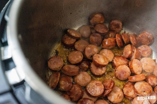 Once the inner pot has fully heated, drizzle the bottom with two tablespoons of peanut oil. Cook the sliced andouille rounds until browned and caramelized around the edges. This should take about five minutes, stirring frequently. Adding a small amount of water (1/4 cup) to the pot after the sausage cooks will help to deglaze and scrape up any crusty bits.