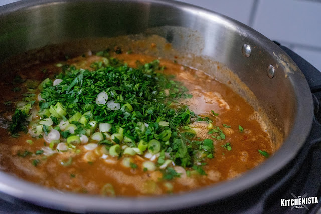 To finish off the gumbo, stir in the chopped parsley and half the scallions. Use the white and lighter green parts of the scallion now, and save the darker green ends to garnish plates when serving.