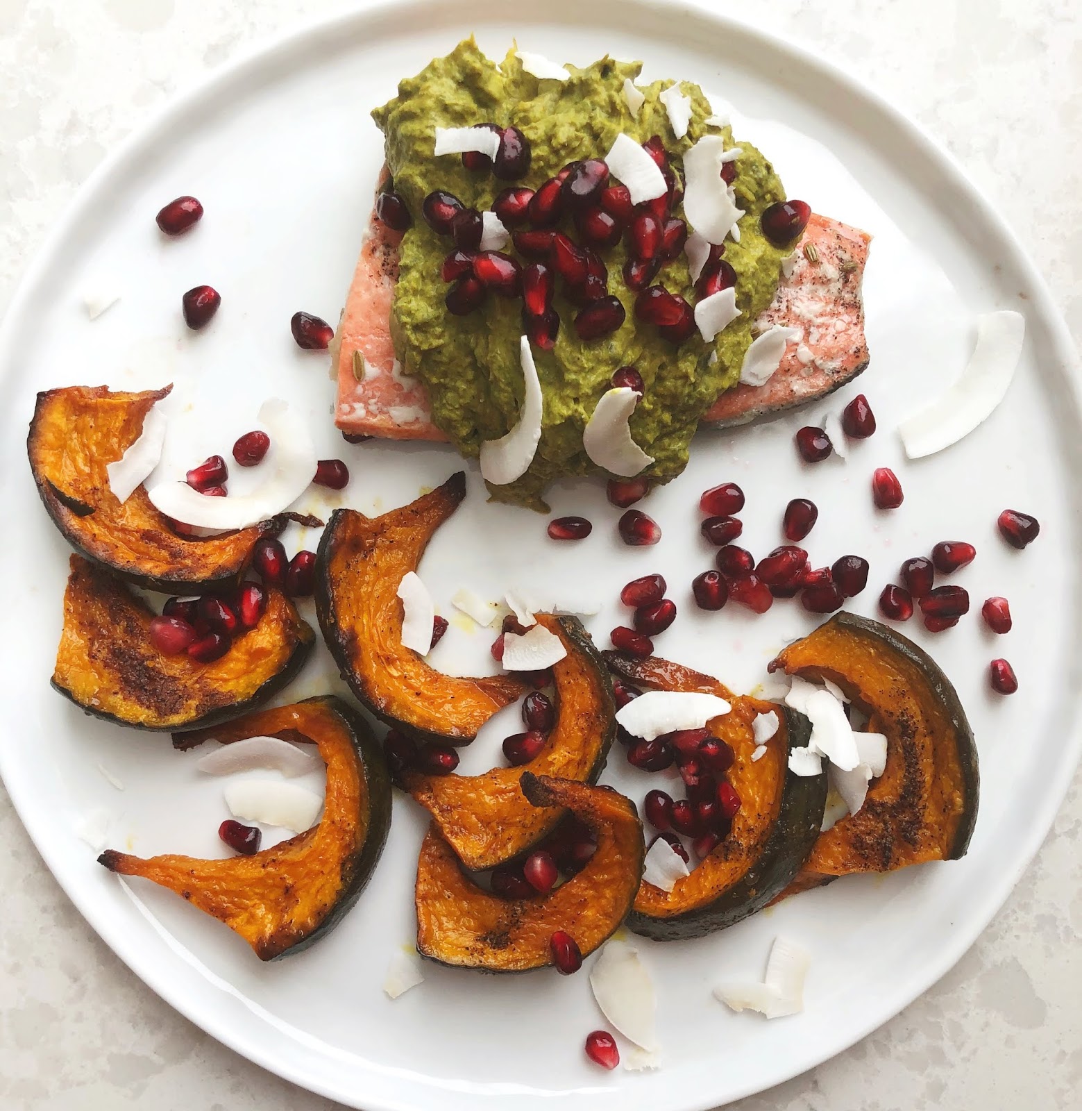 serve fish topped with creamed spinach. add squash to the side and sprinkle everything with flaked coconut, pom seeds & a pinch of flaked sea salt.