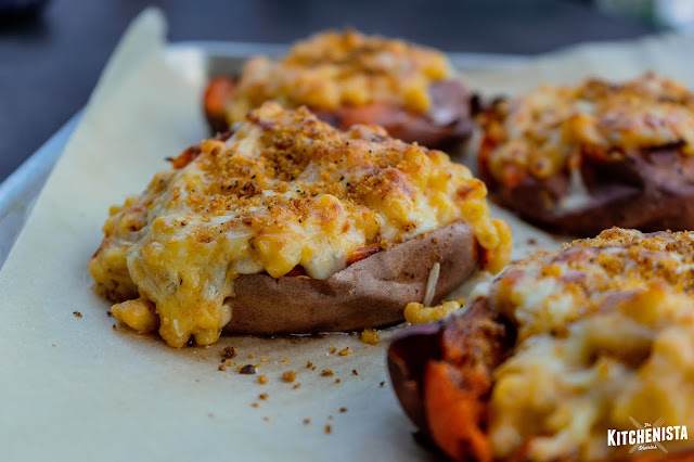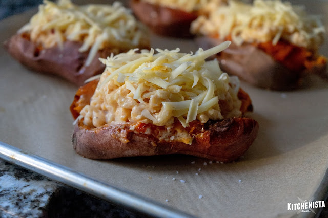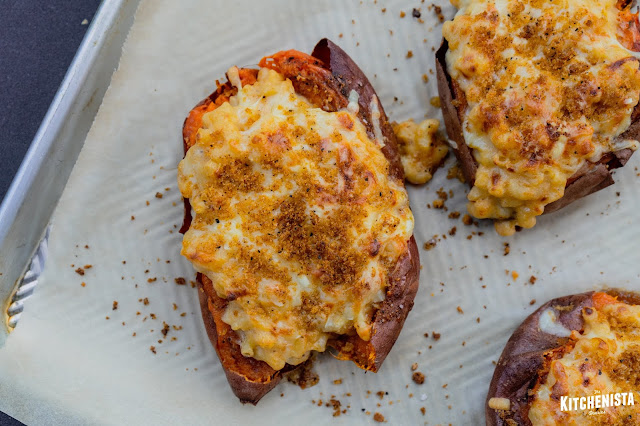 Now for the fun part! You'll need the extra cheese you set aside. Stuff a good pinch of cheese down the middle of each sweet potato. Then fill each sweet potato with a serving of mac & cheese. Finally, top the mac & cheese with the remaining shredded cheese.