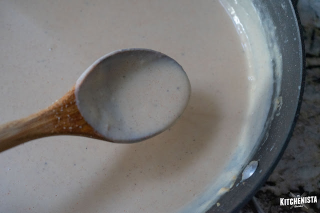 When the sauce is properly thickened it should easily coat a wooden spoon. Taste it and adjust the seasonings as needed. Just remember that cheese has salt, so you don't want the sauce to be salty too.