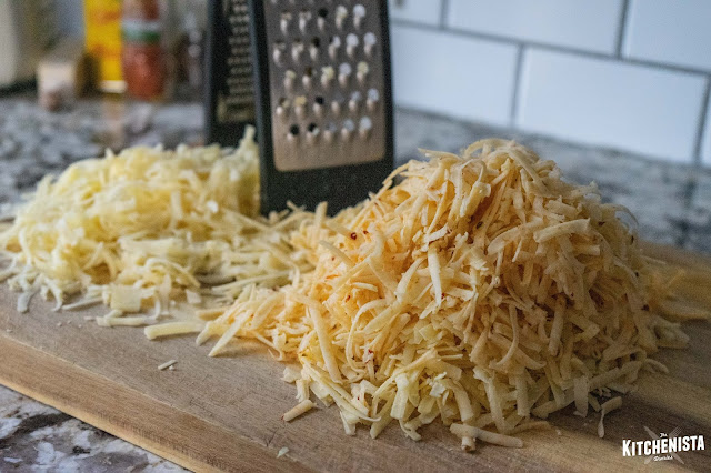 When you shred your cheese, set a third of it to the side. I mixed the cheddar and pepper jack for my cheese sauce and left the Raclette separate. It melts so beautifully that I really wanted that to be the cheese I topped each sweet potato with. But you could just blend all three kinds of cheese and set a third of that aside, whatever works.