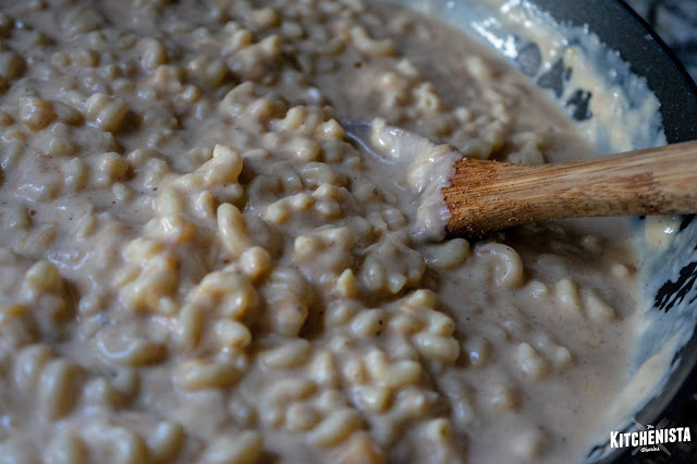 Stir in the cooked elbow noodles. The sauce will first look a bit runny...