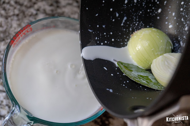 In a saucepan, simmer the milk together with the onion and the bay leaf, until the milk is steaming hot. Then you can strain it and discard the onion and bay leaf.