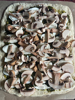 3. Spread basil sauce on pizza dough. Add mozzarella and mushrooms. I used fresh mozzarella, which adds an additional dimension to the pizza.