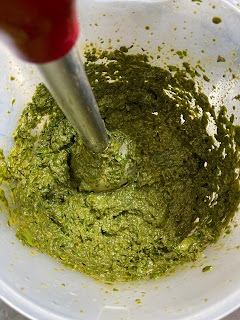 1. Combine basil, oil, Parmesan and garlic in a food processor and blend well. You can also use an immersion blender, which is what I used. You may need to add more oil if the mixture is too thick to blend.