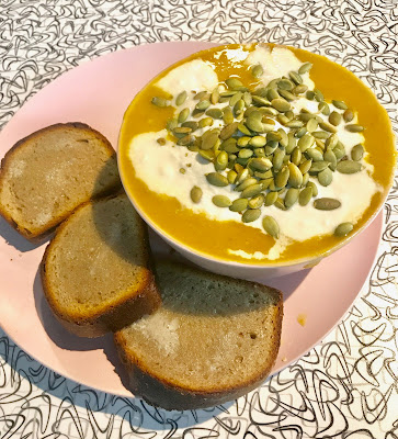 Lunch today was Butternut Squash Soup with Soy Yogurt & Toasted Pumpkin Seeds, plus LuLu's Brioche on the side. The soup was from last Sunday's Vegan Soup Swap and lovingly made by Allie. Very good!